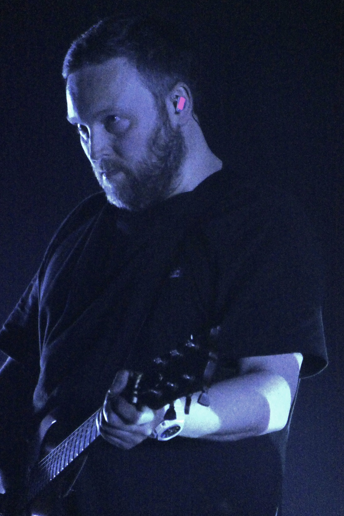 21h05 : La scène de Pleyel est très large pour des musiciens qui ne bougent pas beaucoup comme ceux de Mogwai, concentrés comme ils le sont sur la parfaite exécution de leur post-rock aussi précis que brûlant, et nous avons eu pas mal de chance en nous plaçant au hasard sur la droite, ce qui s’avérera juste devant Stuart Braithwaite, le « leader » (même si on imagine bien qu’il n’aimerait pas ce qualificatif…) du groupe. De plus, il joue assez près du bord de la scène, alors que les autres musiciens sont plus en recul, voire au fond de la scène lorsqu’ils s’assoient – comme le fera régulièrement Barry Burns – aux synthés. A noter aussi la présence, loin sur notre gauche, du jeune guitariste Alex Mackay, qui vient renforcer le quatuor sur scène, et est responsable de plusieurs passages très noise et spectaculaires.